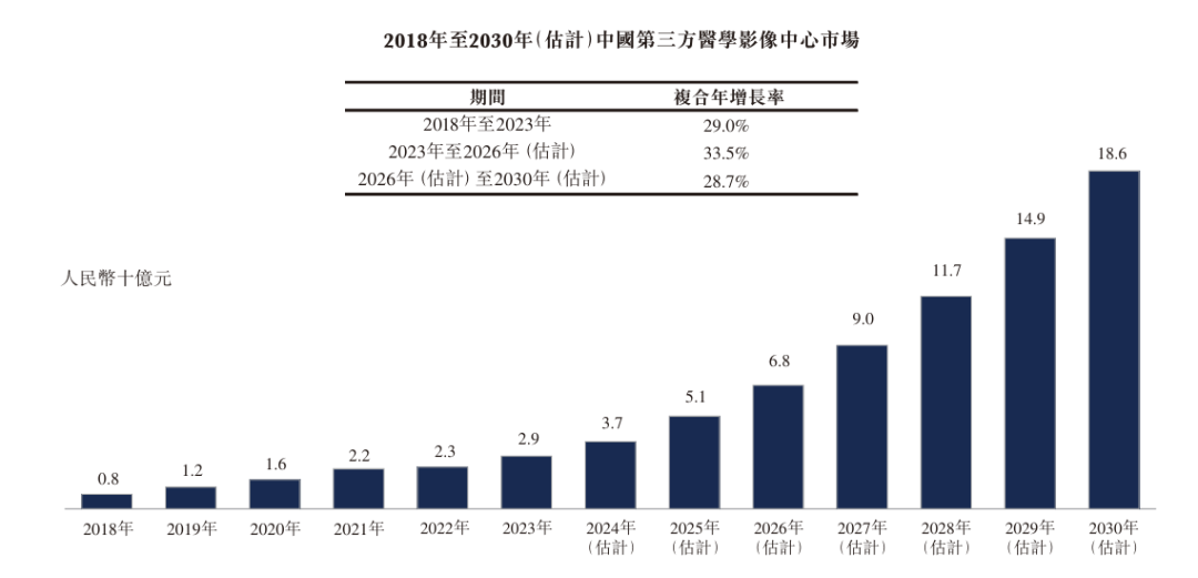 根据弗若斯特沙利文的资料,按收入计,中国医学影像服务市场规模由2018年的1474亿元增长至2023年的2709亿元,复合年增长率为12.9%,预期2030年将达到6615亿元。
