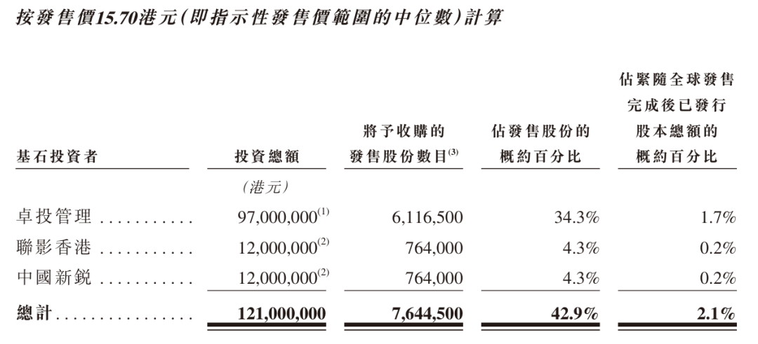 目前,一脉阳光已与基石投资者订立基石投资协议,卓投管理、联影香港、中国新锐三家基石投资者已同意(须受若干条件的规限)按发售价认购总金额1.21亿港元可购买的有关数目发售股份。