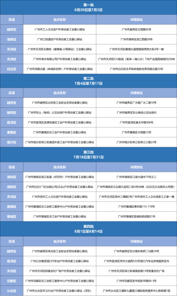 据介绍,今年“致敬高温下的您·户外劳动者爱心雪糕免费送”活动首次覆盖全市各区,其中部分站点为智能化工会爱心驿站和24小时工会爱心驿站。第一阶段的送雪糕活动共分四批进行,将持续至8月14日,每天14:00开始派送,每个站点200支,领完即止。本次活动领取对象为快递员、网约配送员、环卫工人、出租车司机、网约车司机、货车司机、公交车司机、建筑工人、交警等户外劳动者,每人每天可领一支雪糕。户外劳动者可前往相应的工会爱心驿站(具体见表),根据工作人员指引领取雪糕,休息避暑。